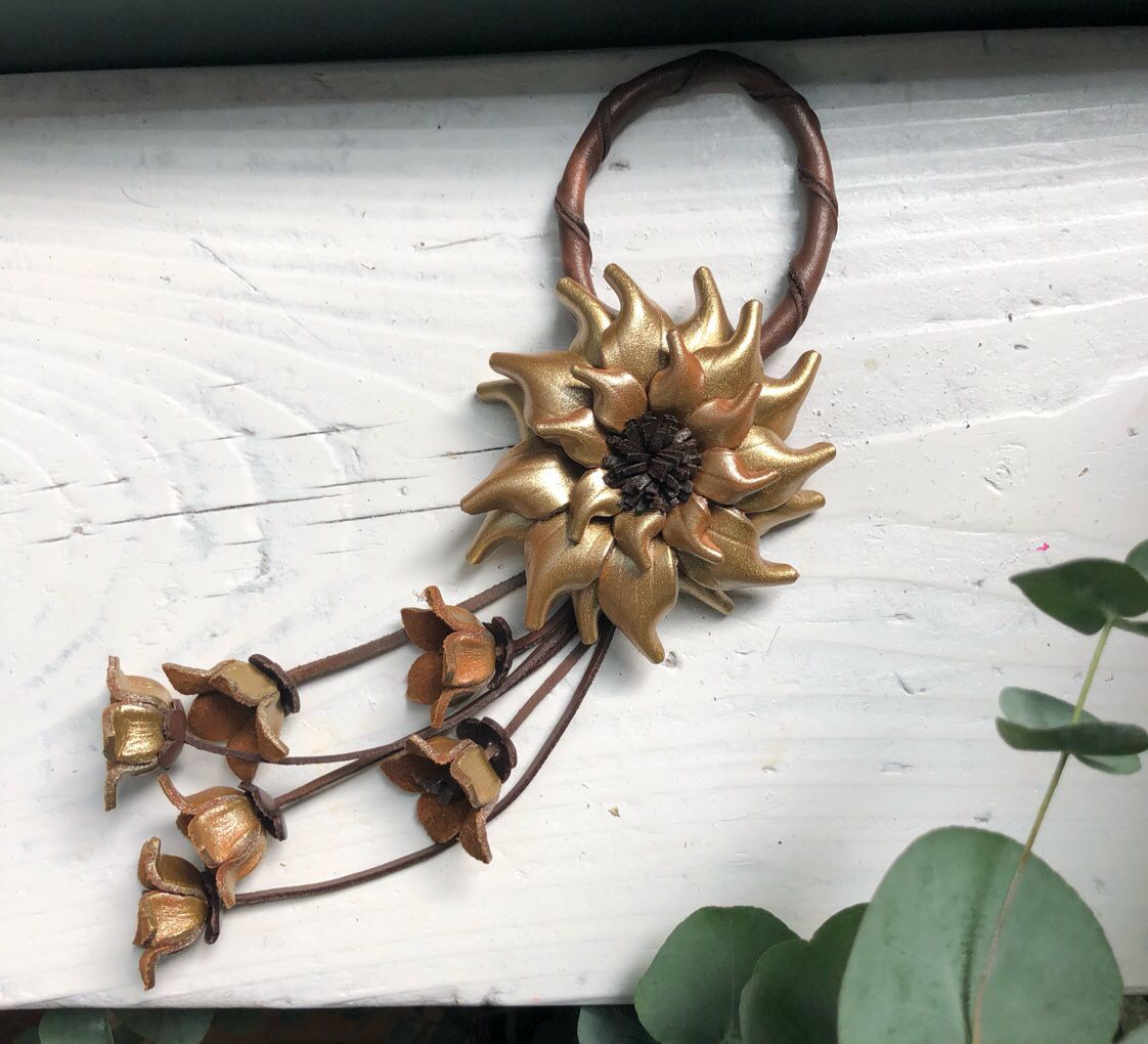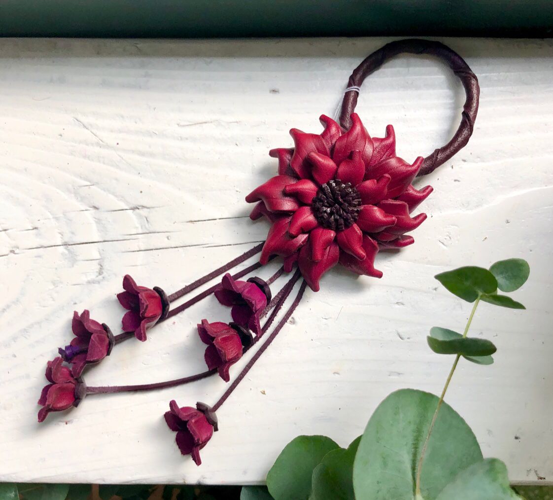 Hoa được làm từ da mộc, có quai gài và nút bấm phía sau rất tiện lợi