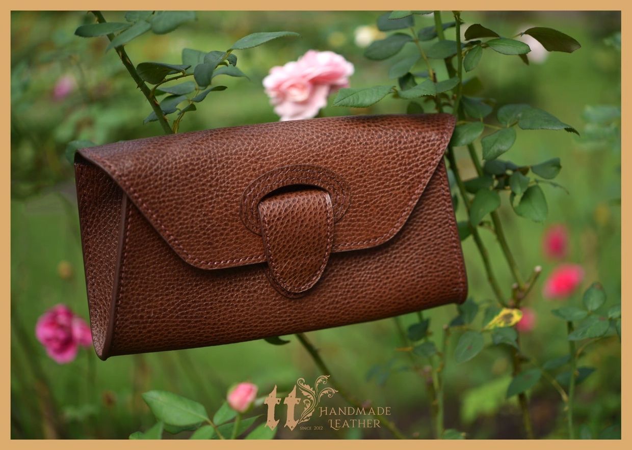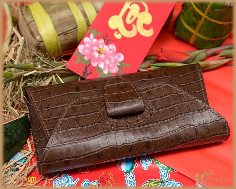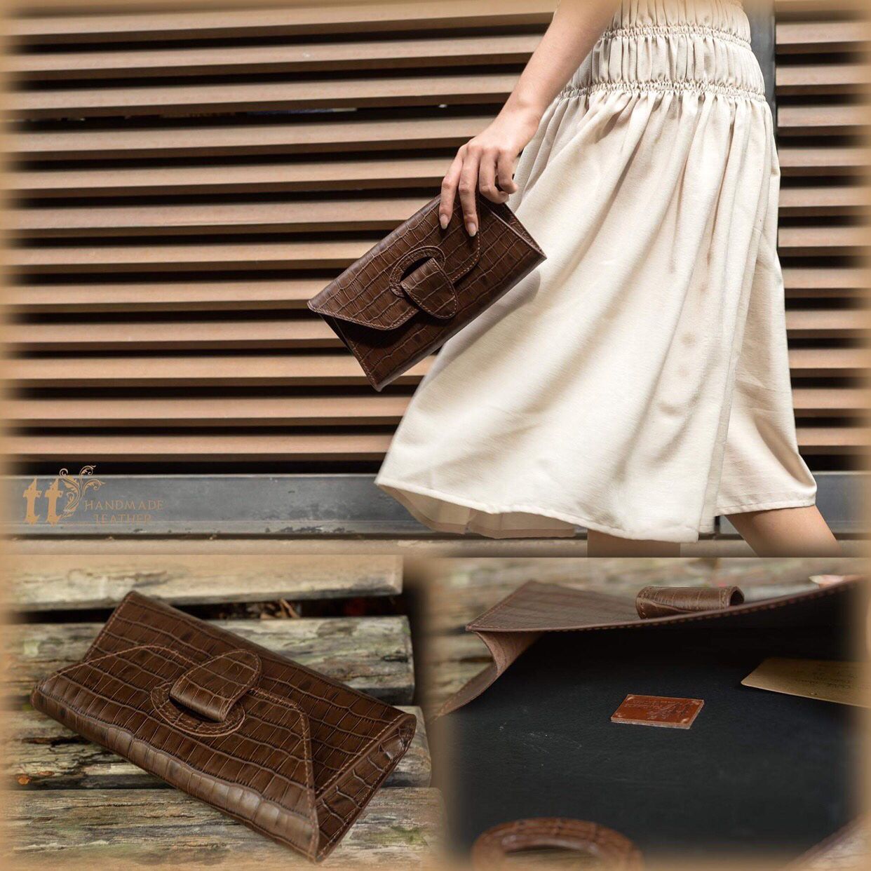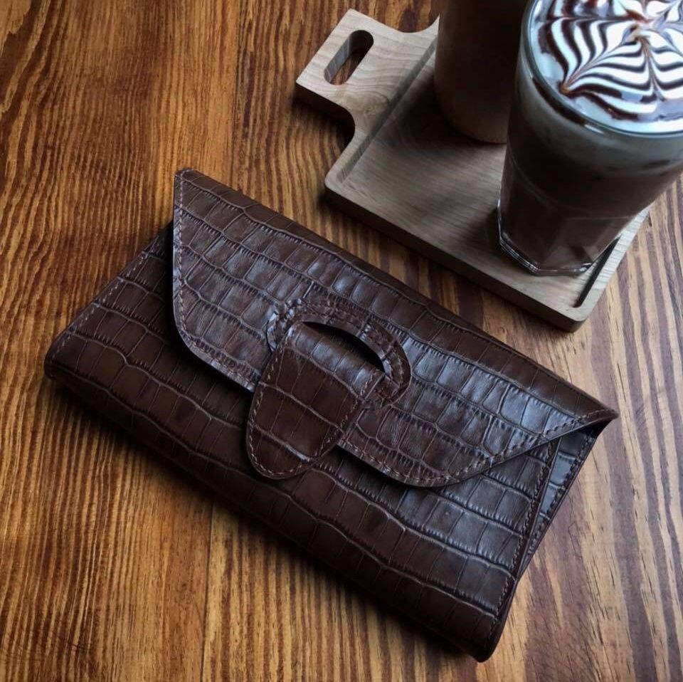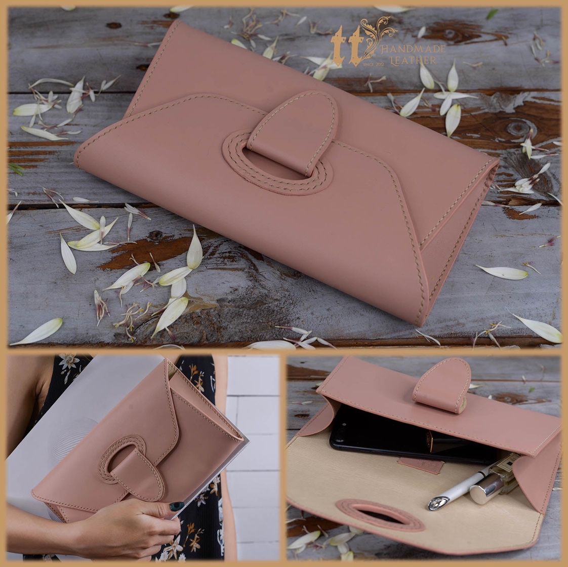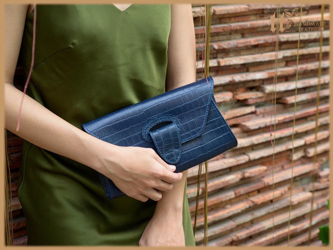Clutch ngang 24cm, cao 12cm; được may tay tỉ mỉ, sơn viền cẩn thận, bên ngoài là da bò, bên trong có lót da heo.