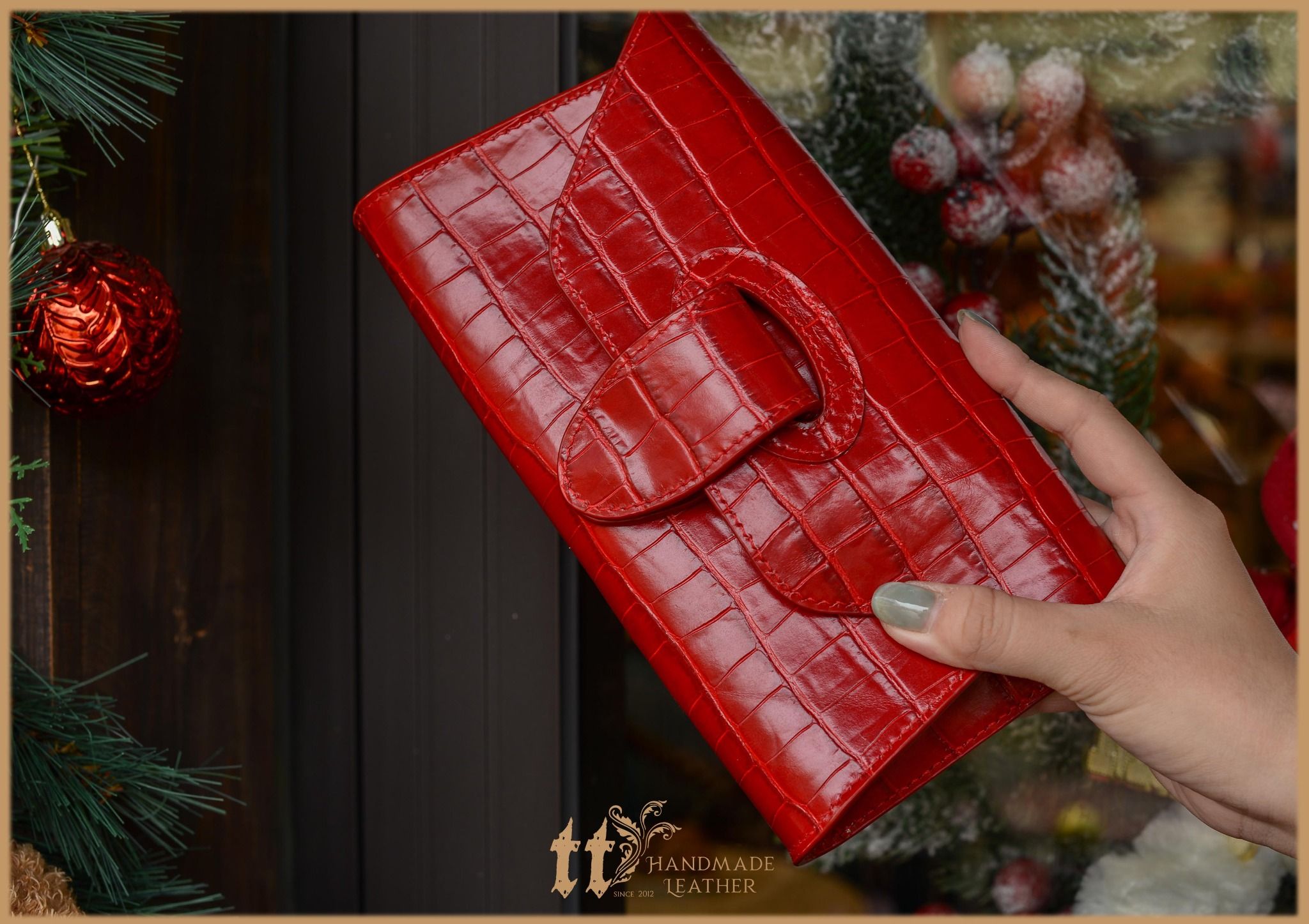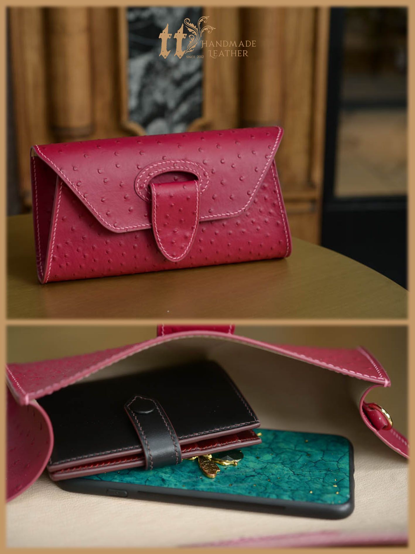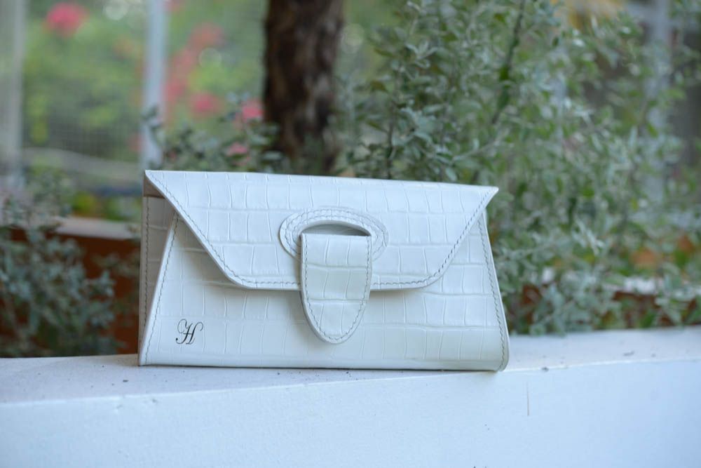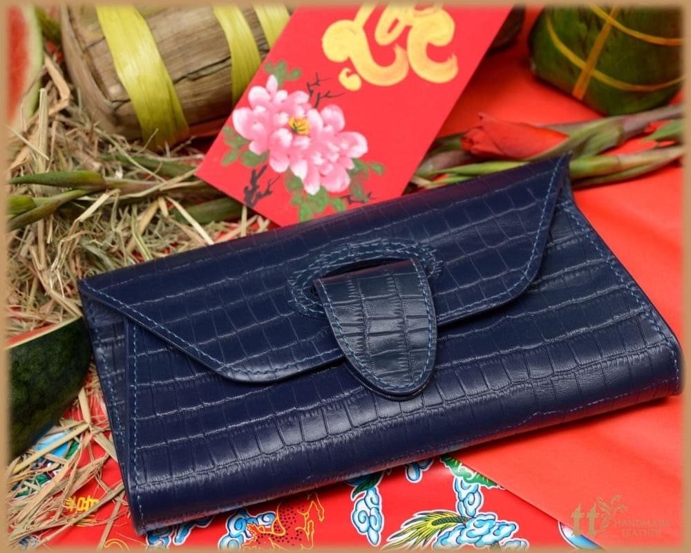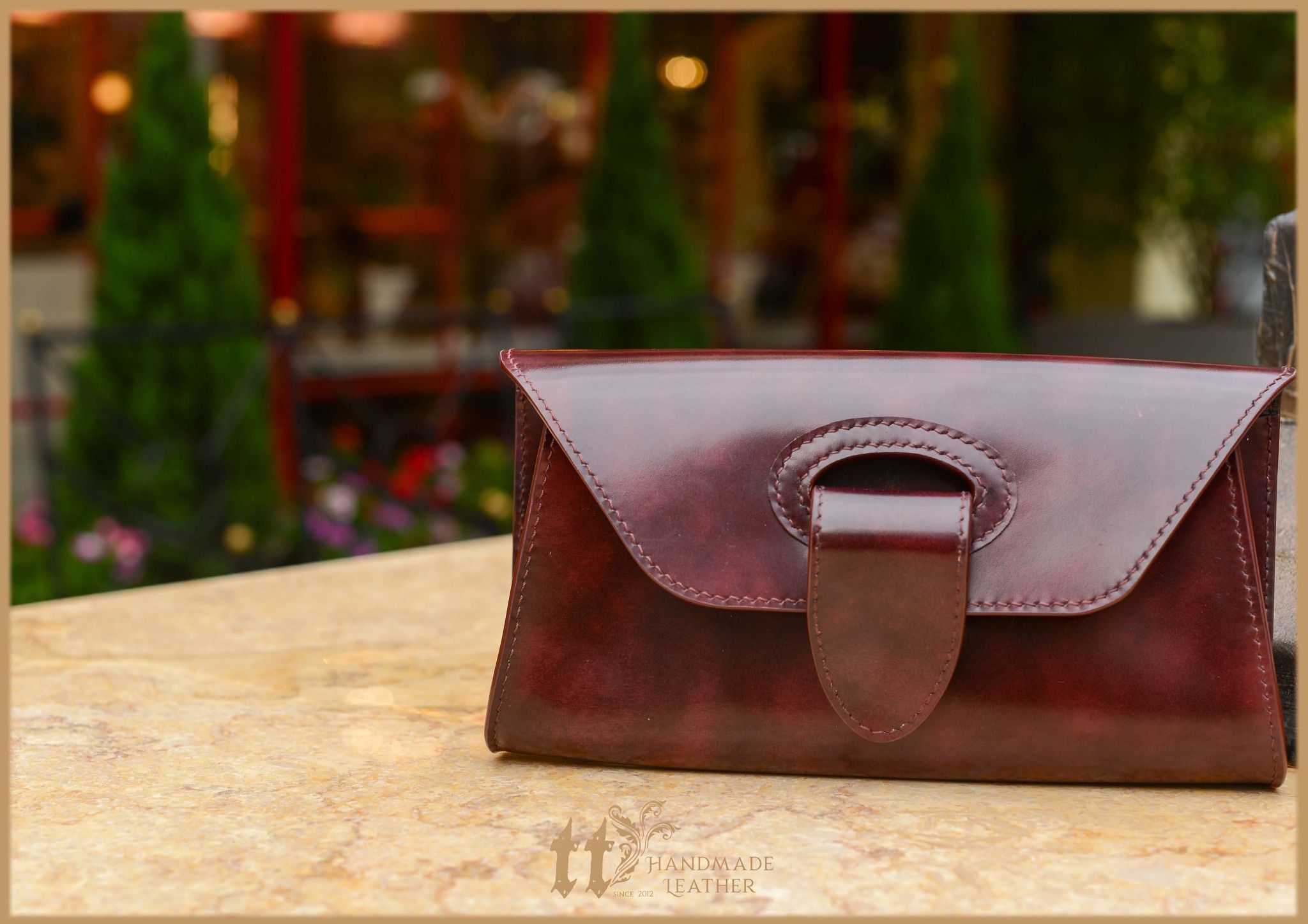 Clutch ngang 24cm, cao 12cm; được may tay tỉ mỉ, sơn viền cẩn thận, bên ngoài là da bò, bên trong có lót da heo.