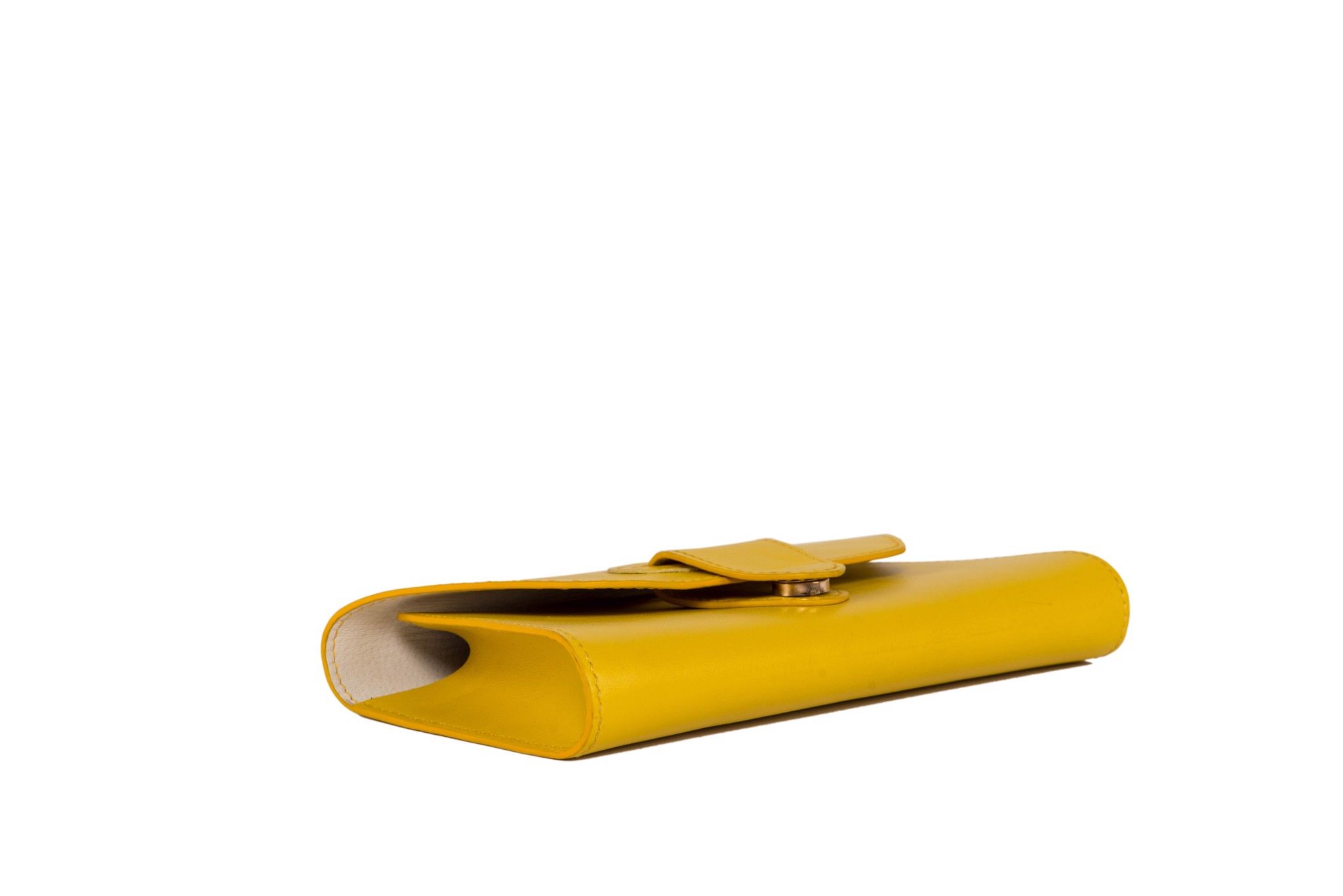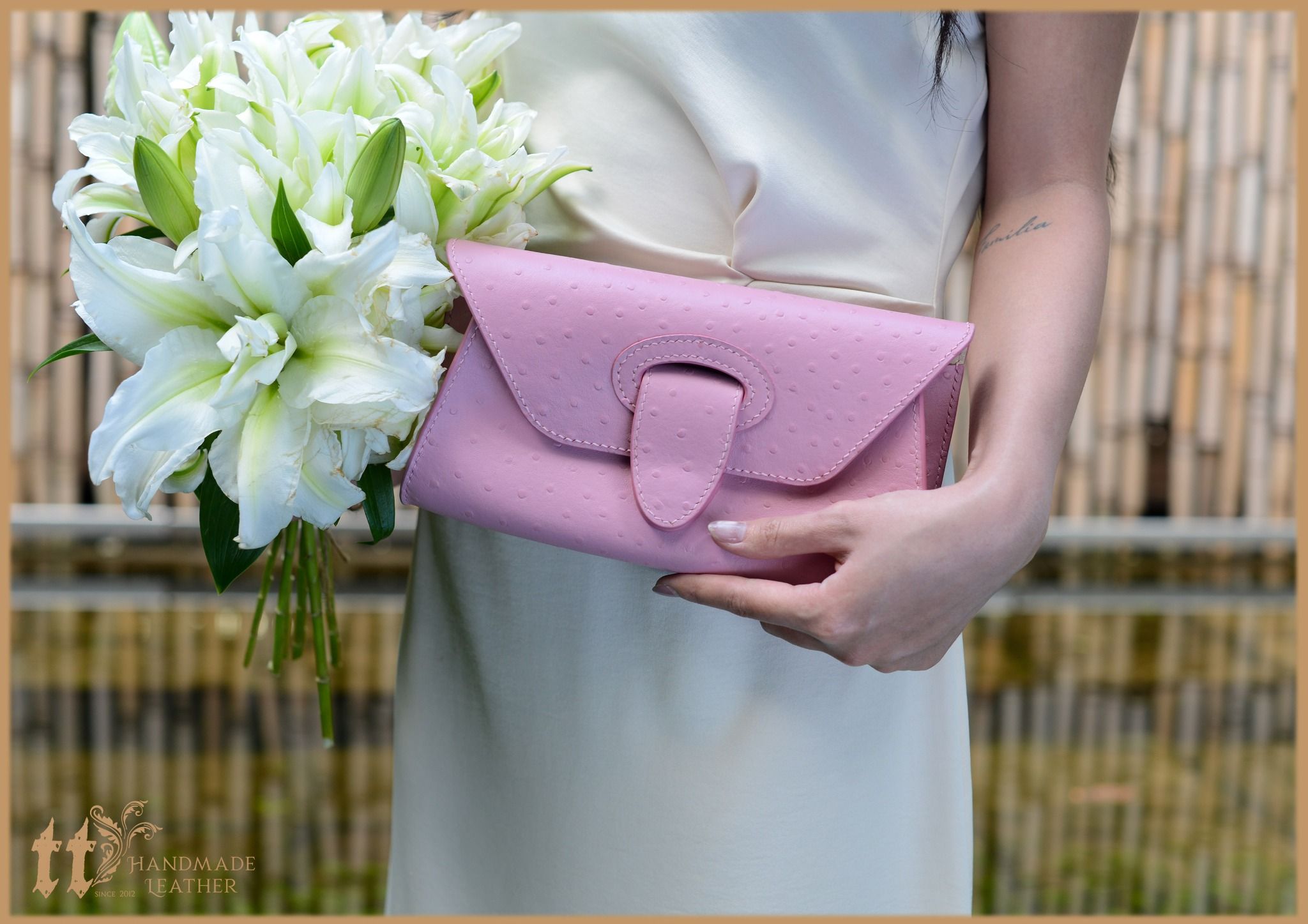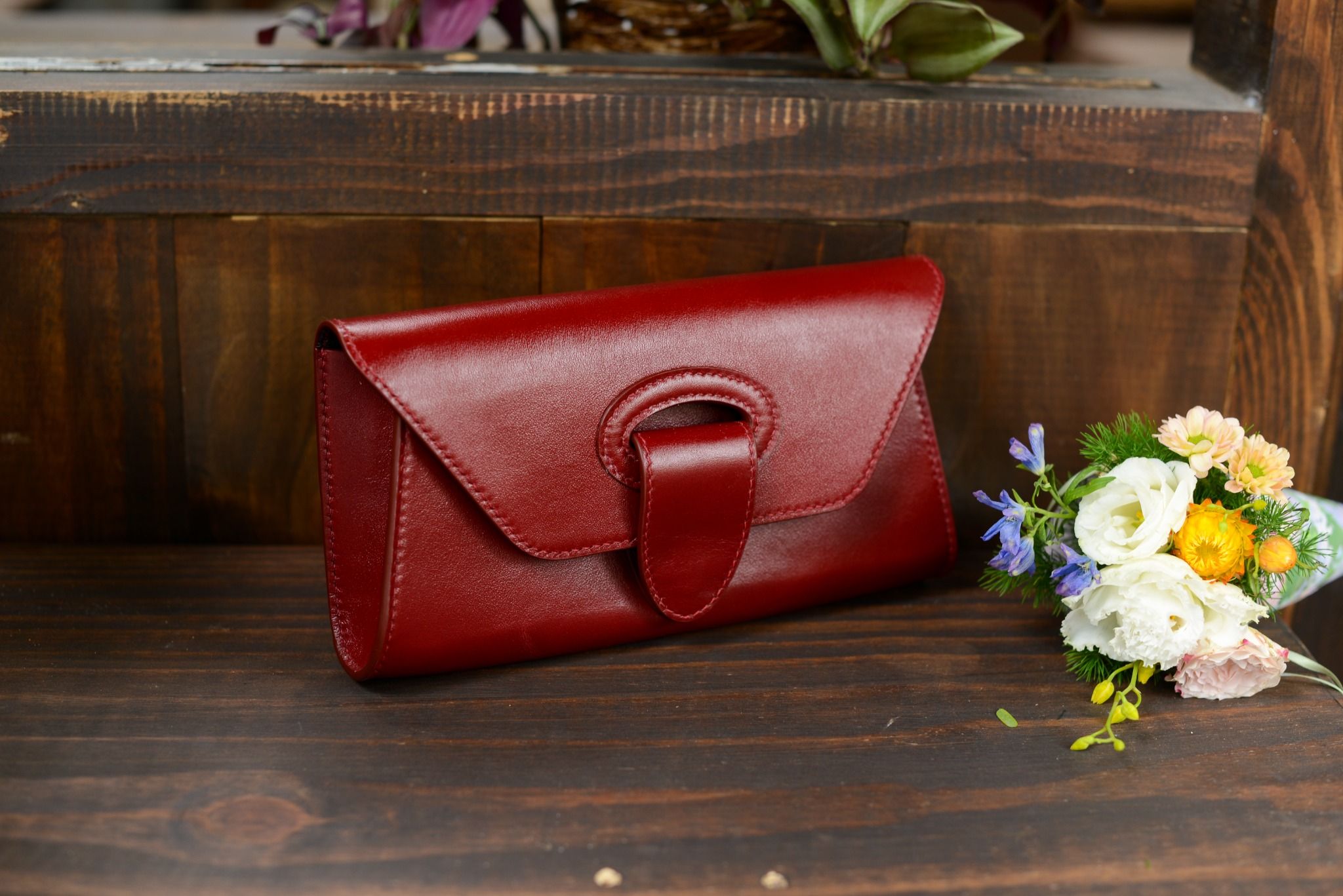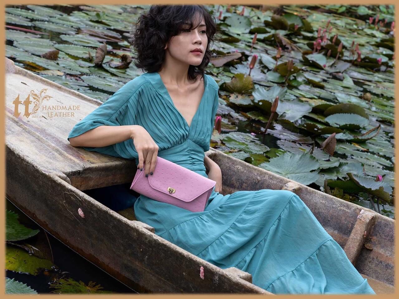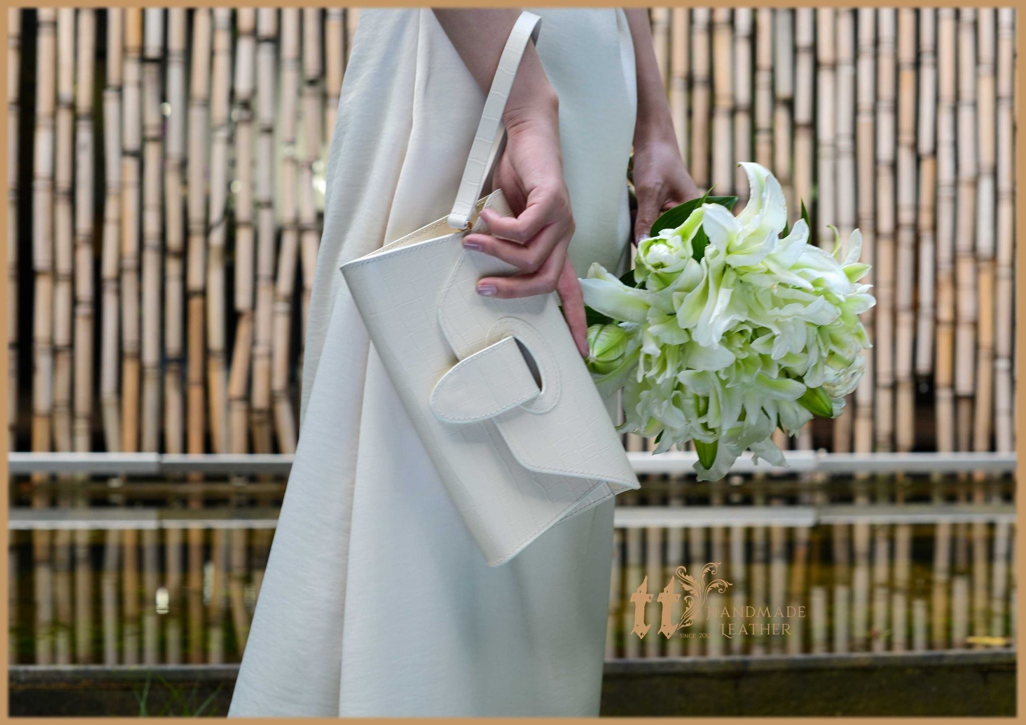 Clutch ngang 24cm, cao 12cm; được may tay tỉ mỉ, sơn viền cẩn thận, bên ngoài là da bò, bên trong có lót da heo.