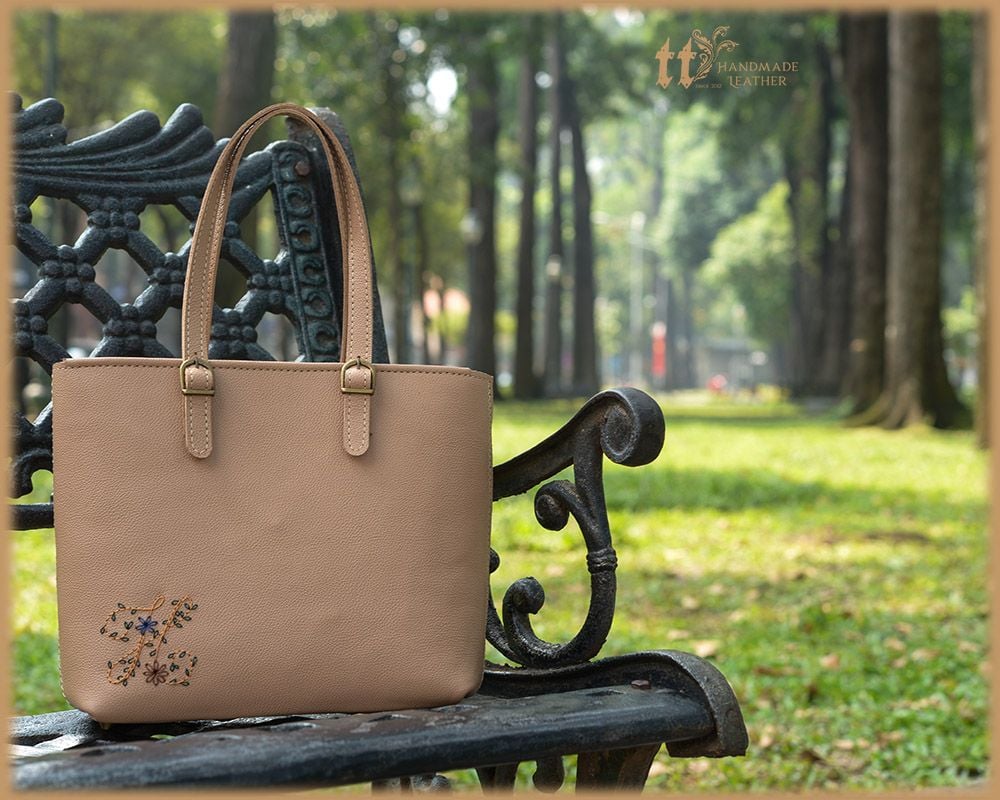 Túi được may tay trên chất liệu da bò thật 100%, bên trong có lót da heo. Túi có khóa kéo.