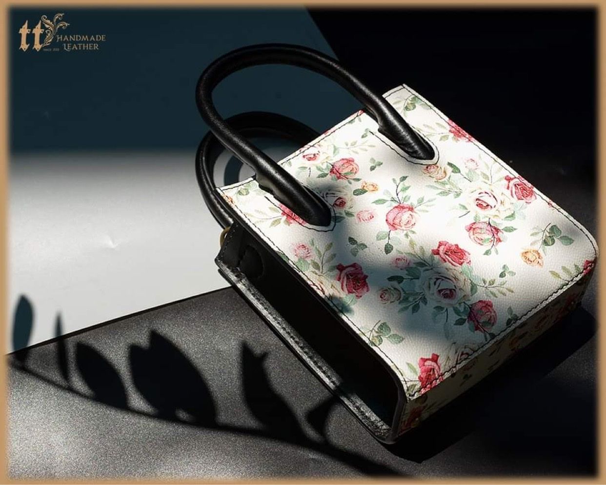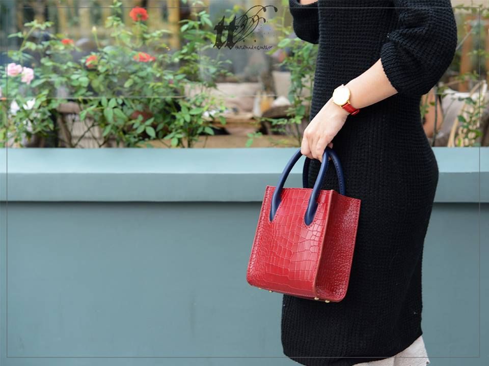 - Kích thước túi: ngang 18cm, cao 20cm, đáy 9cm. Túi được may tay bằng da bò, bên trong có lót da heo, sơn viền tỉ mỉ.