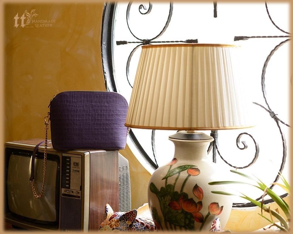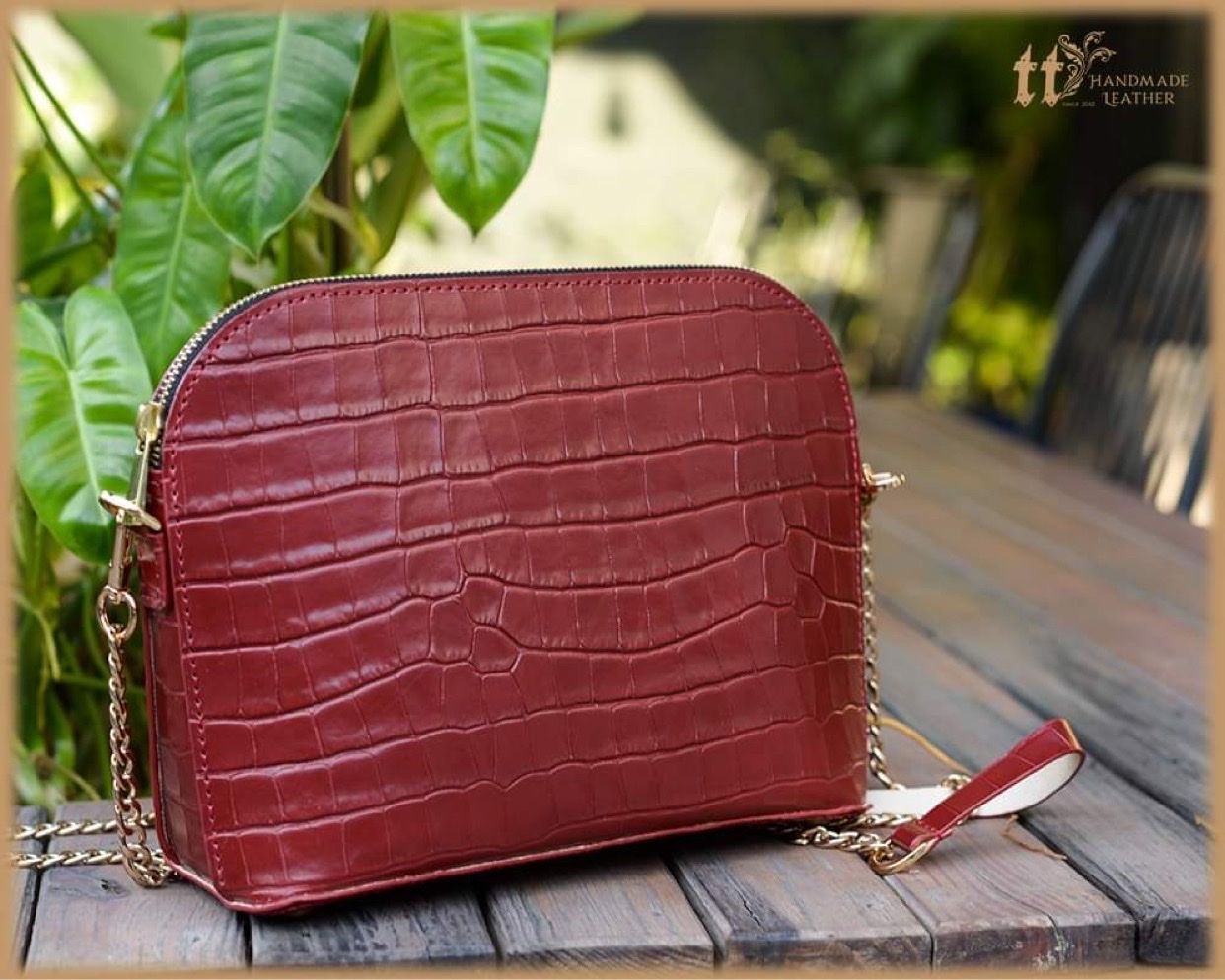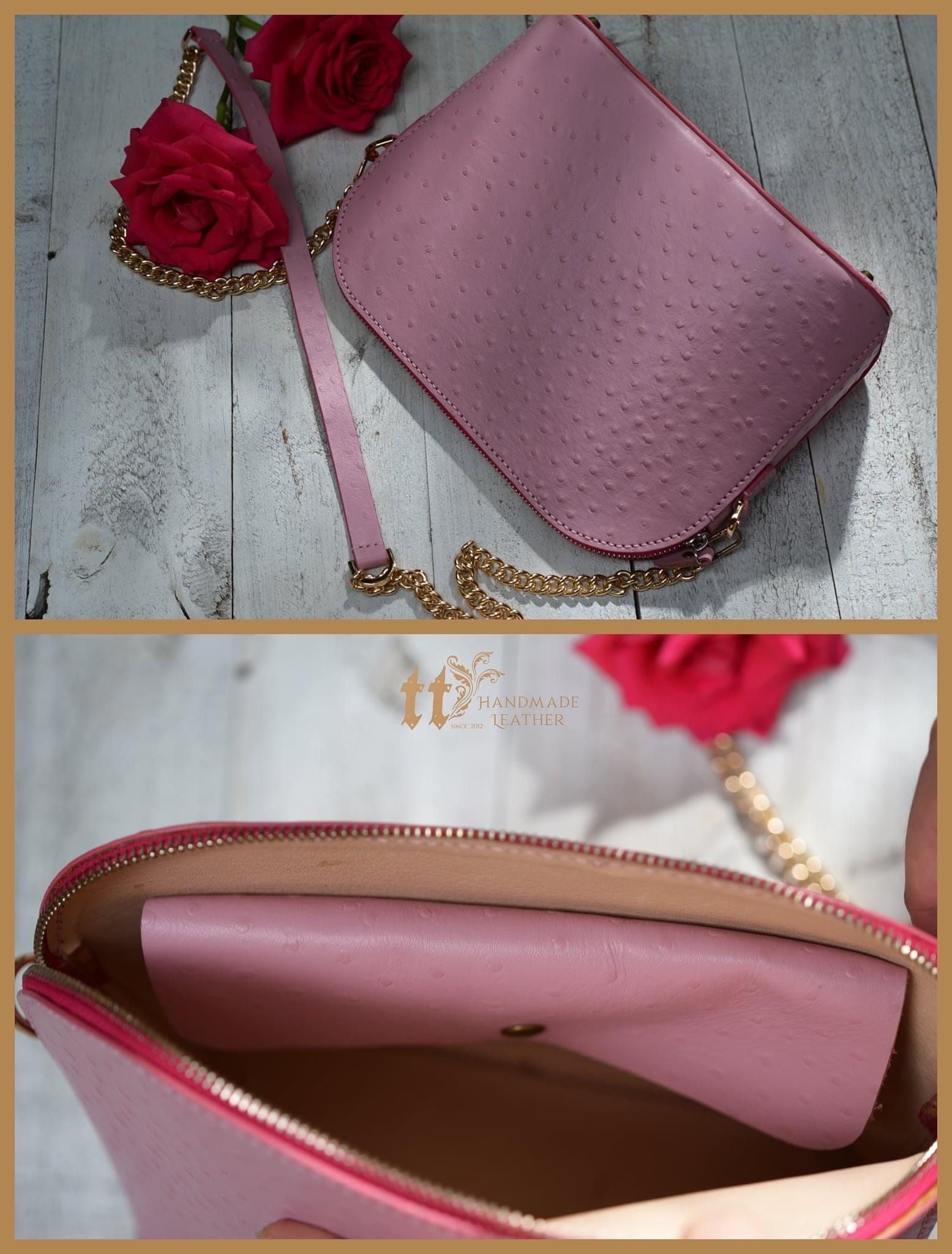 Dáng túi nhỏ xinh, đáy túi rộng nên chứa được nhiều phụ kiện, ngoài ngăn chính rộng rãi túi còn có ngăn phụ đựng phone và tiền. Túi được may thủ công bằng da bò, bên trong có lót da heo, sơn cạnh cẩn thận.
