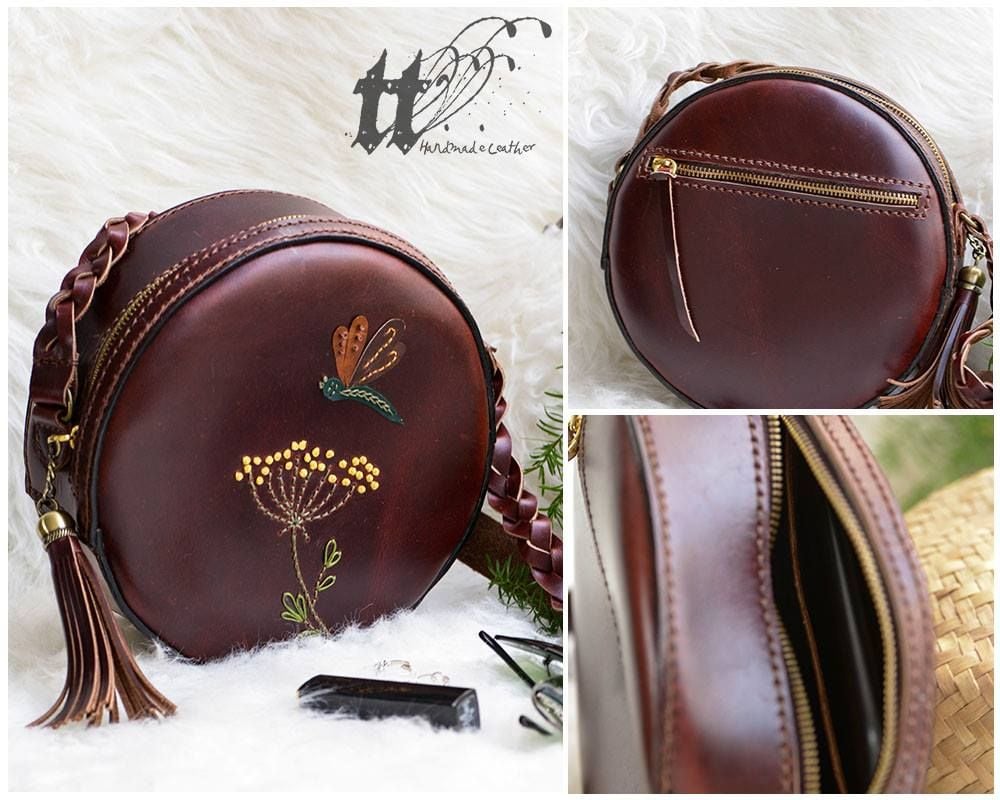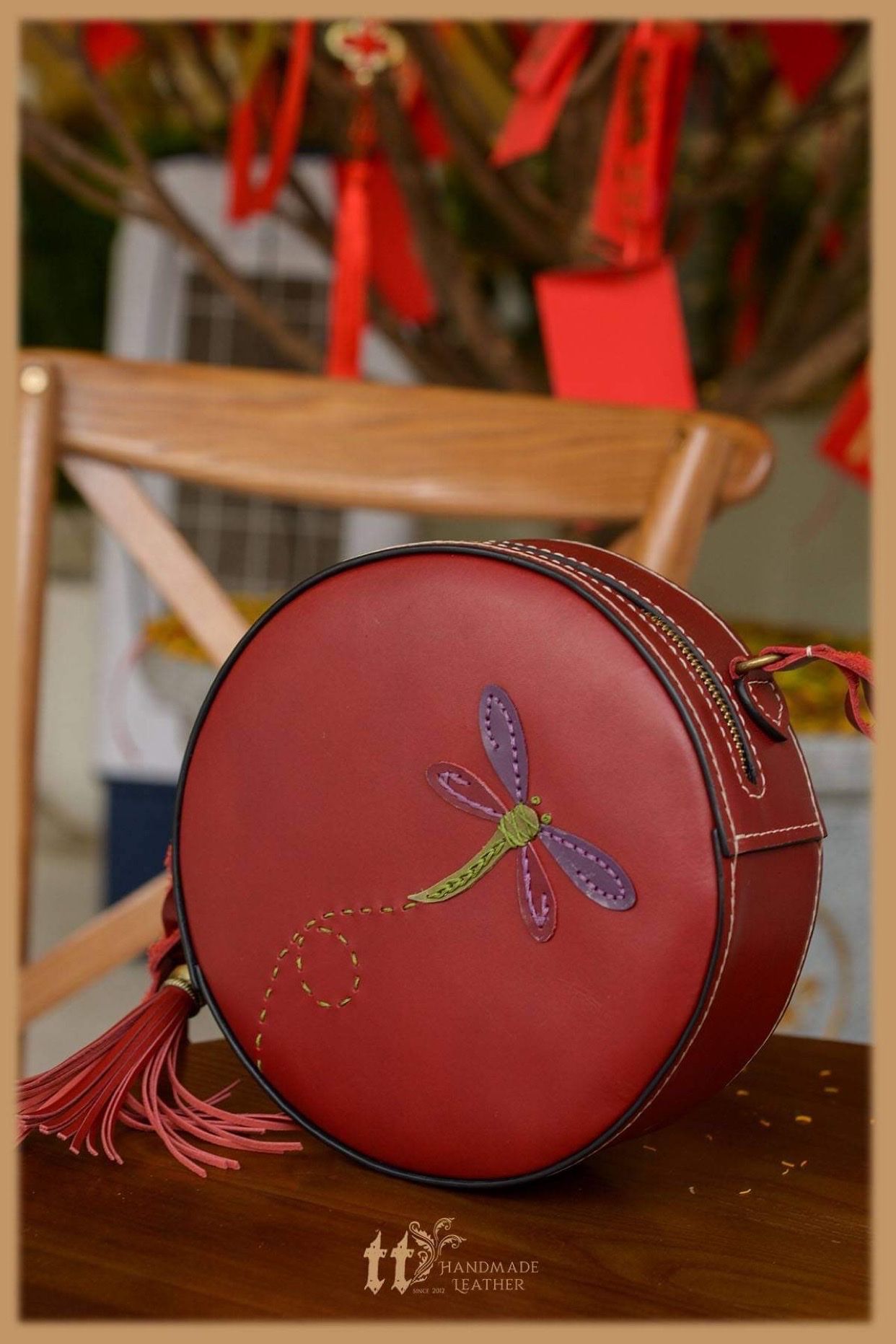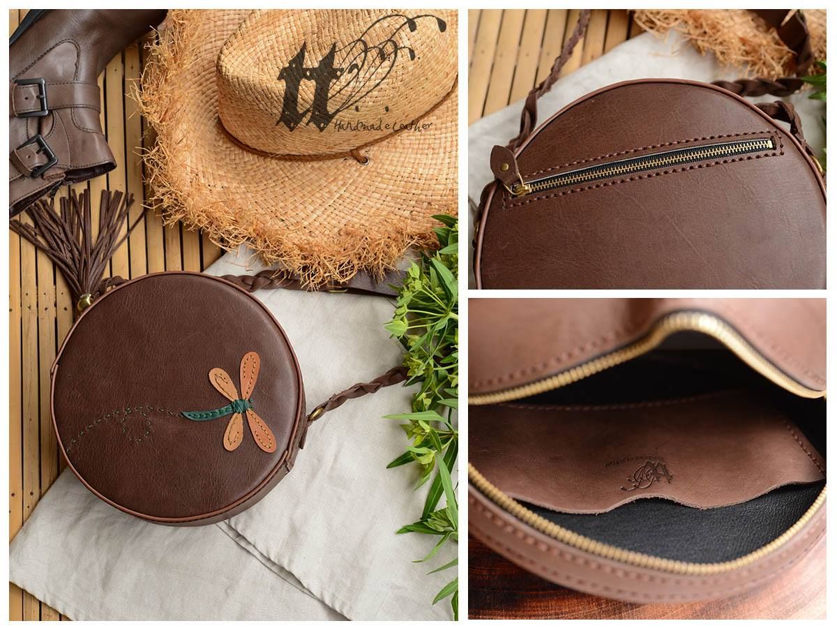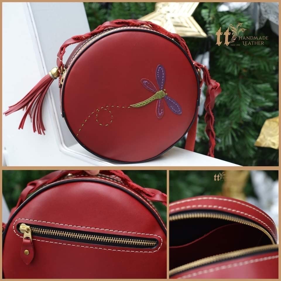 - Túi tròn thêu chuồn chuồn, đường kính 21cm, đáy 6cm, có 1 ngăn khoá kéo phía sau, 1 ngăn chính và 1 ngăn phụ đựng phone.
