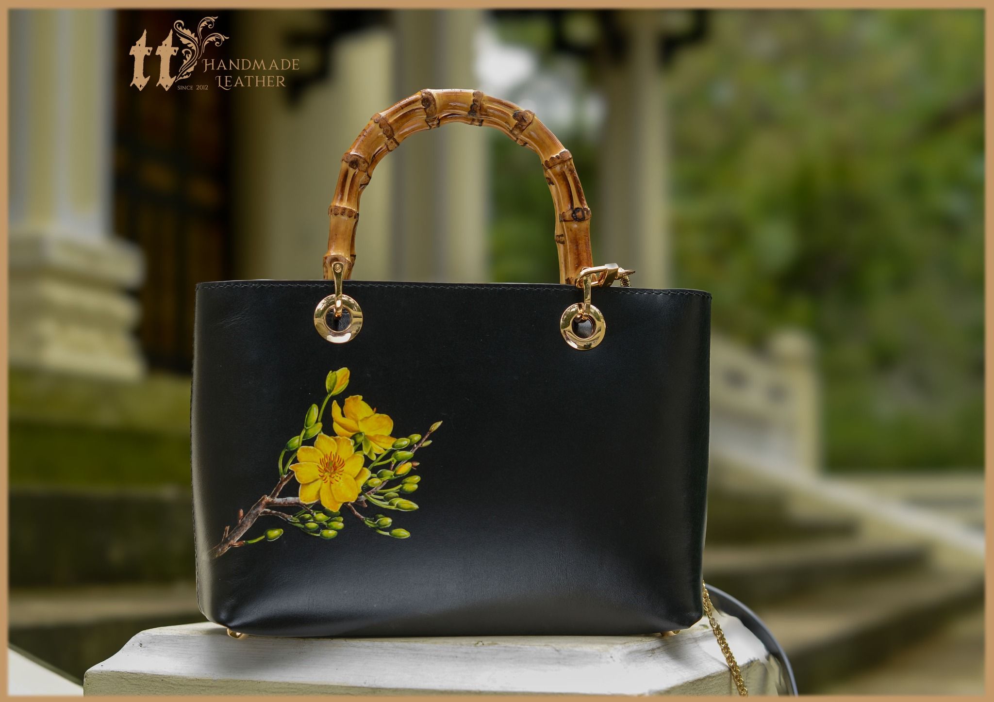 - Quai túi làm bằng trúc được người thợ nung nóng để uốn cong nên có vết màu nâu tự nhiên của lửa hồng trên thanh trúc.